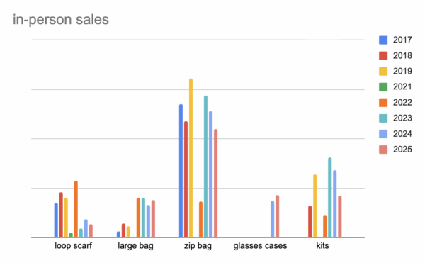 I track some of the items I sell to see trends year over year. In 2025, I decided to basically discontinue the scarves and other wearables that I had been making. I sold some of my remaining inventory at a couple of small shows this year, but I am not really making any new pieces. I added the animal glasses cases that I have been making to the chart this year because those have turned into a best seller. The cost of the materials on those has gone up because of tariffs, so I am unsure how long I will be able to keep them as a best seller. Nothing really surprised me here. I had about 6 in-person events I participated in; 2 were new, 4 I have done before.