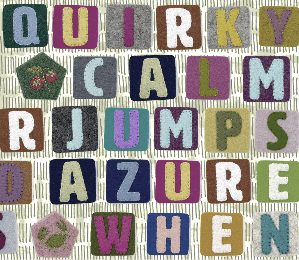 On Thursday this week, I am doing a curator talk for a show that I served as co-curator for. It was a super fun experience and I decided that I wanted to make something to wear for the event. The theme of the show was mixed media, so I decided to design a mixed media fabric and make a dress. I am working on an alphabet book, so I have stitched the entire alphabet in felt letters. I already took photos of them for the book and I love when I can reuse art, so I pulled them into a Photoshop canvas and decided to write a pangram sentence, or a sentence that uses every letter of the alphabet. I thought it would be funny if it was something slightly sewing themed, so came up with “When vexed by quirky design, calm stitcher jumps for bold azure threads”. I layered the letter photos with some handdrawn pencil lines and a painted texture in the background and desaturated the colors a little bit. You can see my finished fabric there in the center.