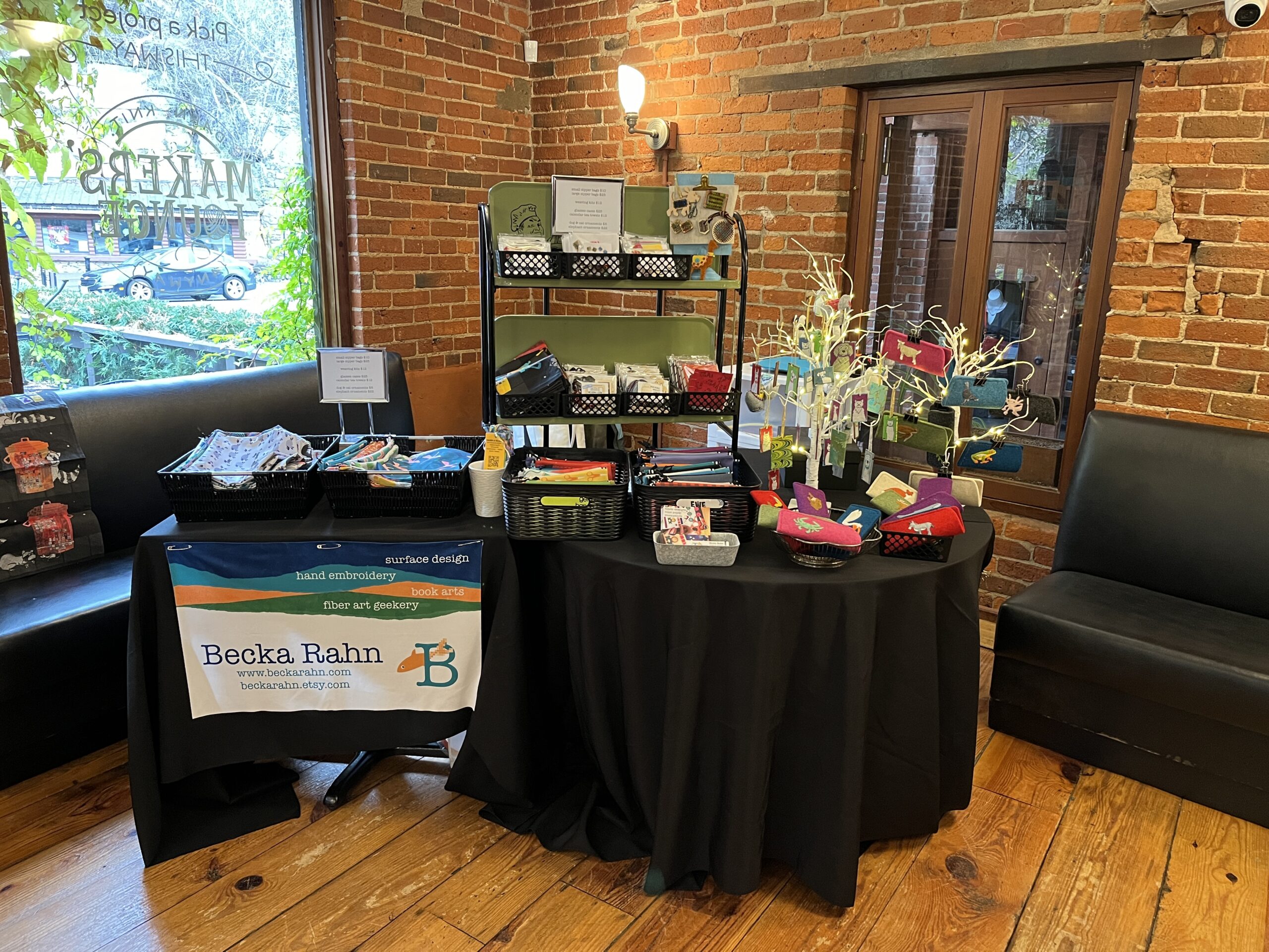 The floor you see is our basement floor. We discovered that the basement walls were too light so there are a whole bunch of black tablecloths that I use for art shows clipped to the floor joists to make a black curtain.