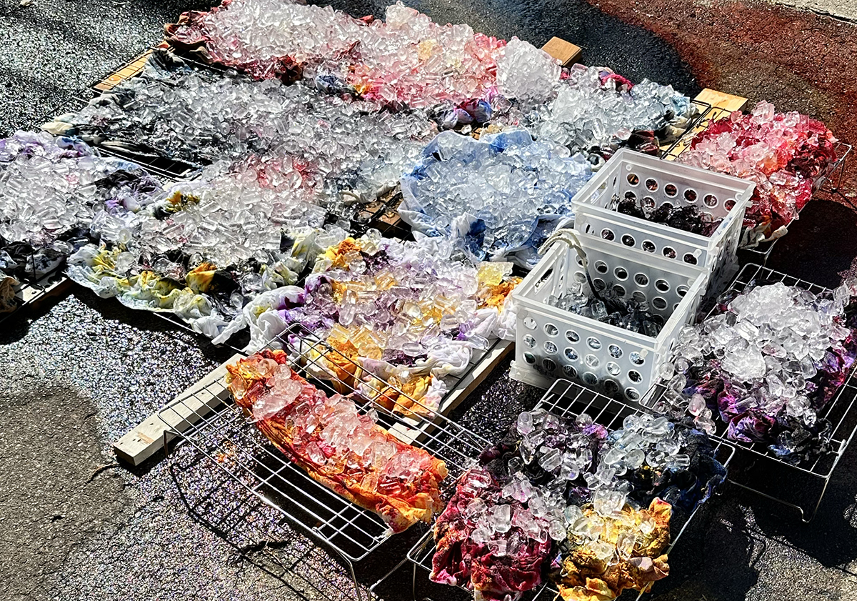 I went with what seemed like the most likely thing to work based on what I know about these dyes. So we soaked some things in soda ash, crumpled them up on mesh drying racks and various things from the garage, covered them with ice and sprinkled on some dye. I had 3 different reds/pinks, 3 different yellows, navy, blue, purple and two blacks. It was almost 90 degrees so we let them sit and bake out in the sun for about 6 hours. I brought everything in and loaded it into the washer. I rinsed some loose dye off of a couple of pieces, but I didn’t do a big rinse step, which was probably my mistake.