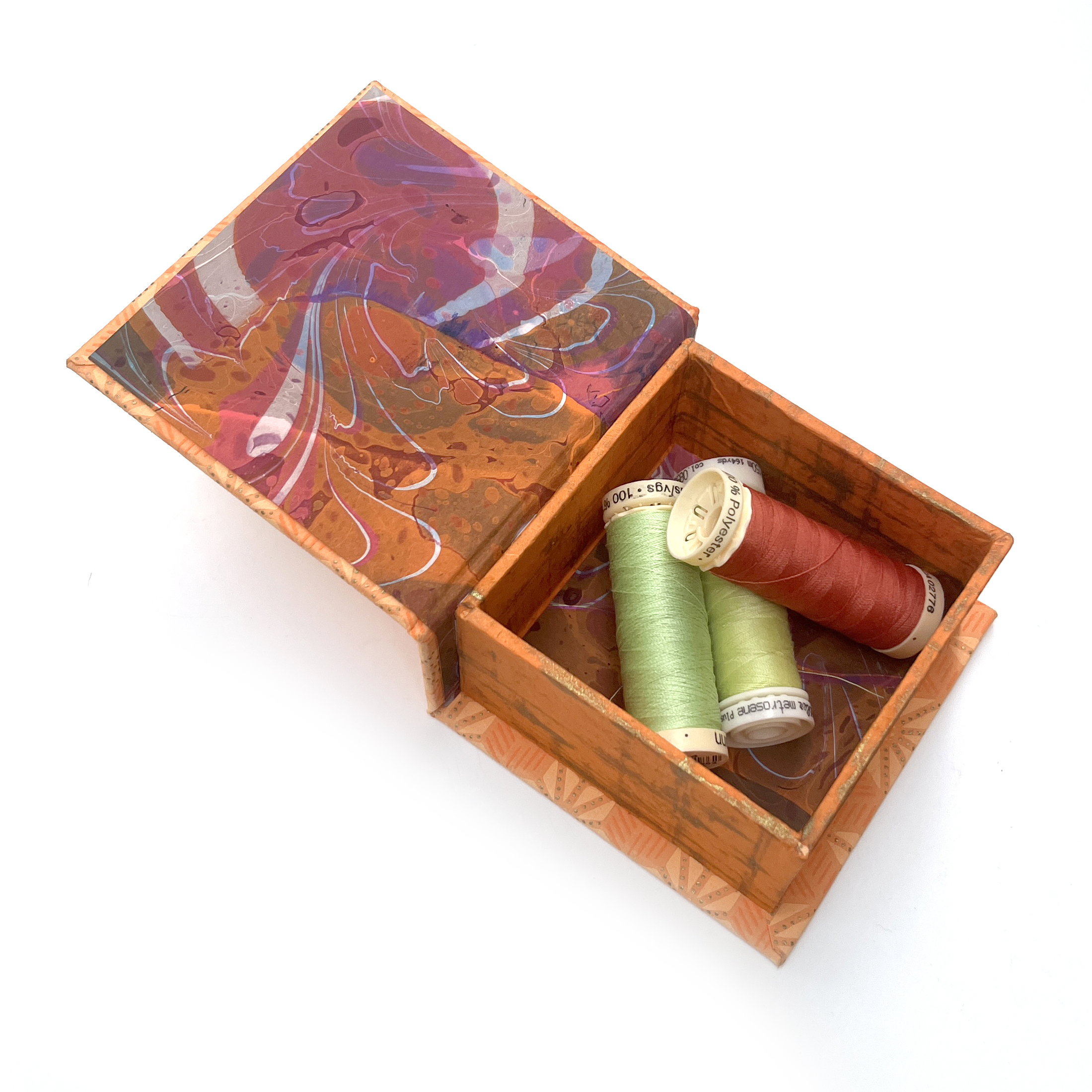 Get an intro to the art of cartonnage or box-making. You’ll make a small clamshell-style box, made entirely from paper. Choose from handmade and patterned patterns to make your cover and inner liner. Your finished trinket box will be about three and a half inches square with an attached hinged lid.