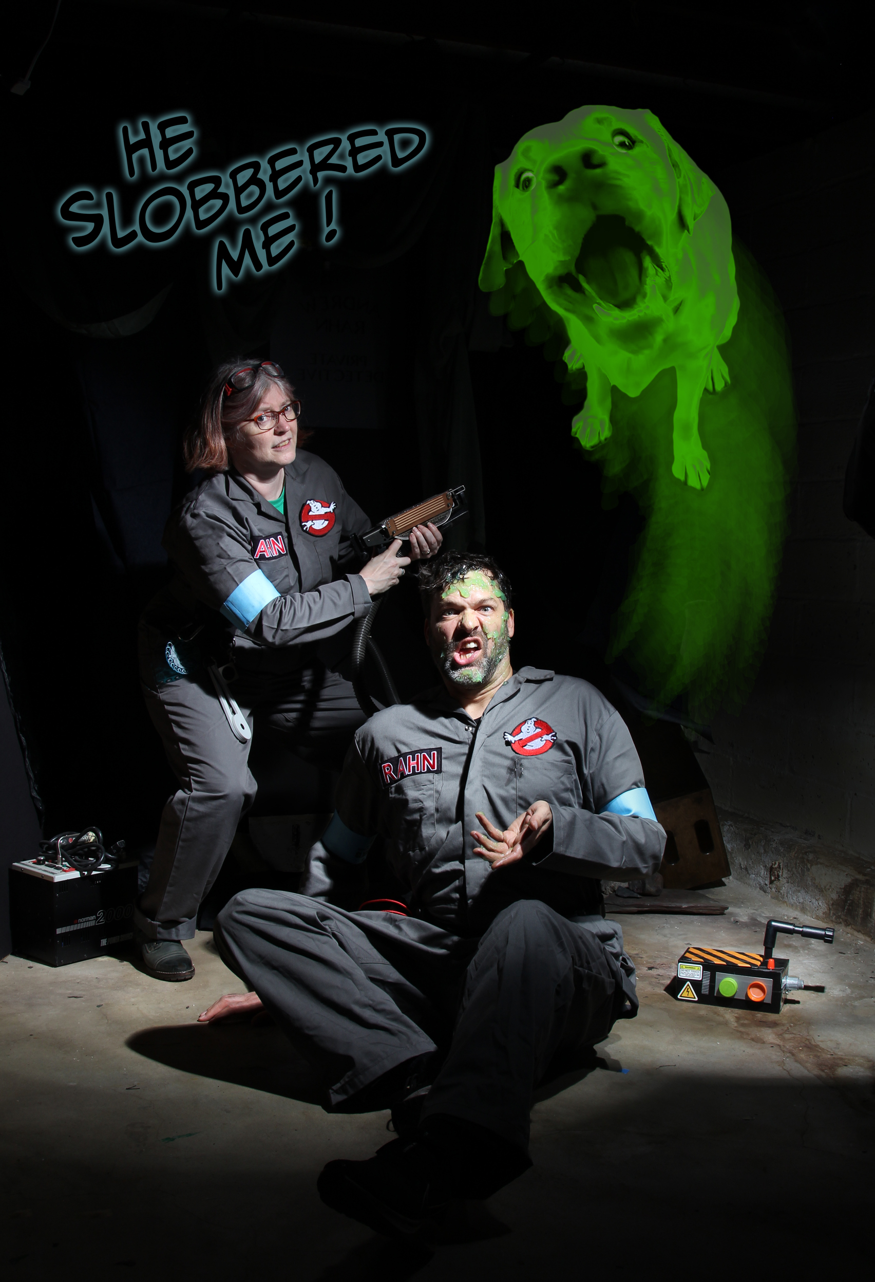You don’t end up being able to see it in the finished photo but the same foam core door we used for the “Andrew Rahn, Private Detective” photo from a few years ago is also in the background. So I guess we are exterminating the ghosts from the detective’s office. We can see it on our big computer before the photo is all compressed down to share on the social media etc.