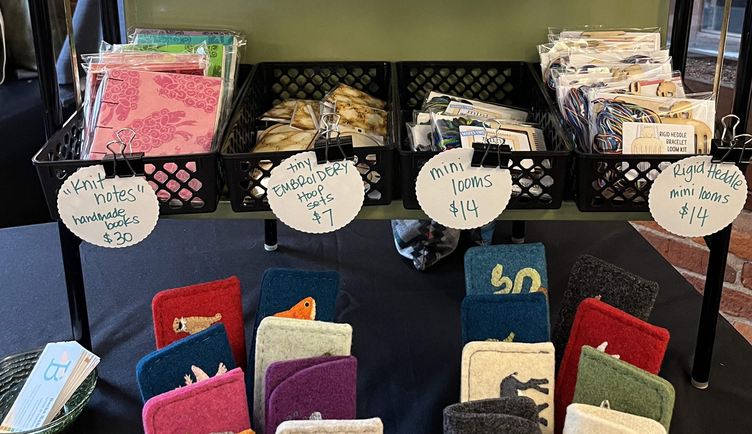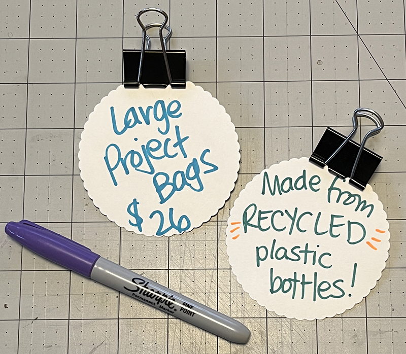 I save them from show to show, but I often have new items or new messages that I need to post, so I love having a bag of coasters and sharpies to make new signs on the fly. I also use them for “bullet points” about my items like the note that the bags are made from recycled plastic bottles or to say I have “other animal designs available, ask for your favorite”.