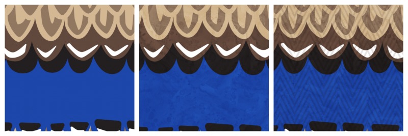 I drew a vector illustration for this design, layering the feathers so I could make a repeating pattern. I felt like the design was a little flat. I often feel this way about vector designs, I often feel like they need a little more texture. So I layered it first with a watercolor pattern to give it some light/dark/grunge. Then I added a chevron stripe to mimic the “grain” of feathers.